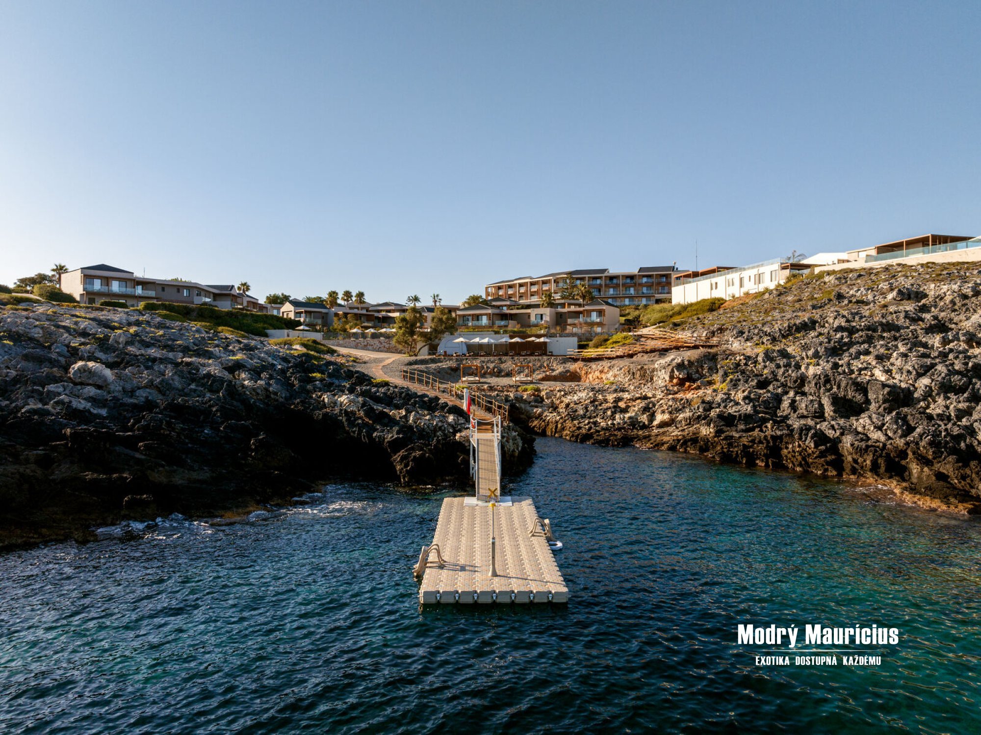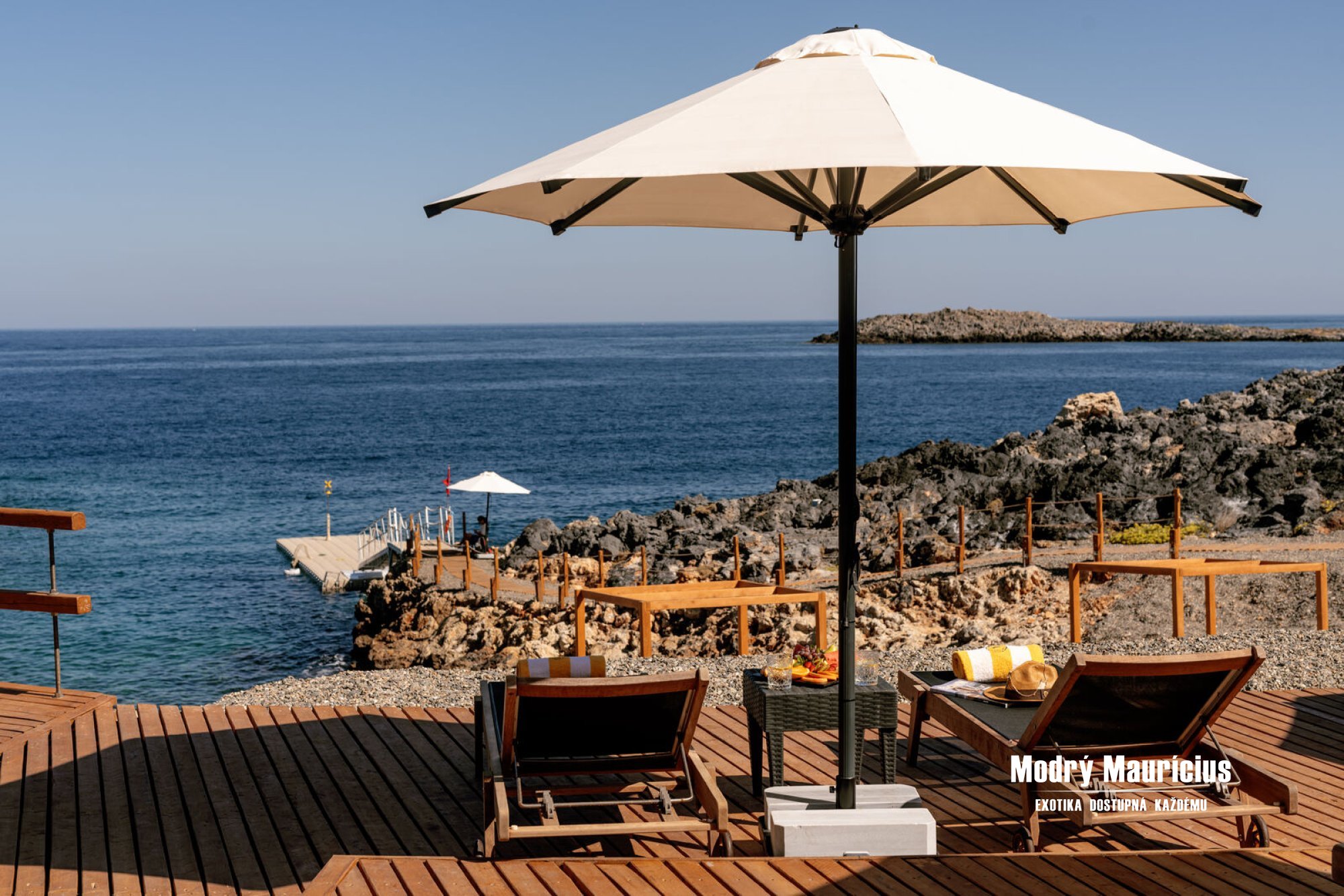 Aulūs Chania, Curio Collection by Hilton sa rozprestiera priamo pri pobreží, avšak niekoľko metrov nad morom, na skalnatom výbežku. Cesta k moru je teda pomerne neobvyklá, no o to čarovnejšia. Až k Egejskému moru vedie drevený chodník a na jeho konci sa nachádza mólo. Nechýbajú tu ani slnečníky s lehátkami a hojdacie siete, ktoré sú rôzne rozmiestnené pri hladine vody.