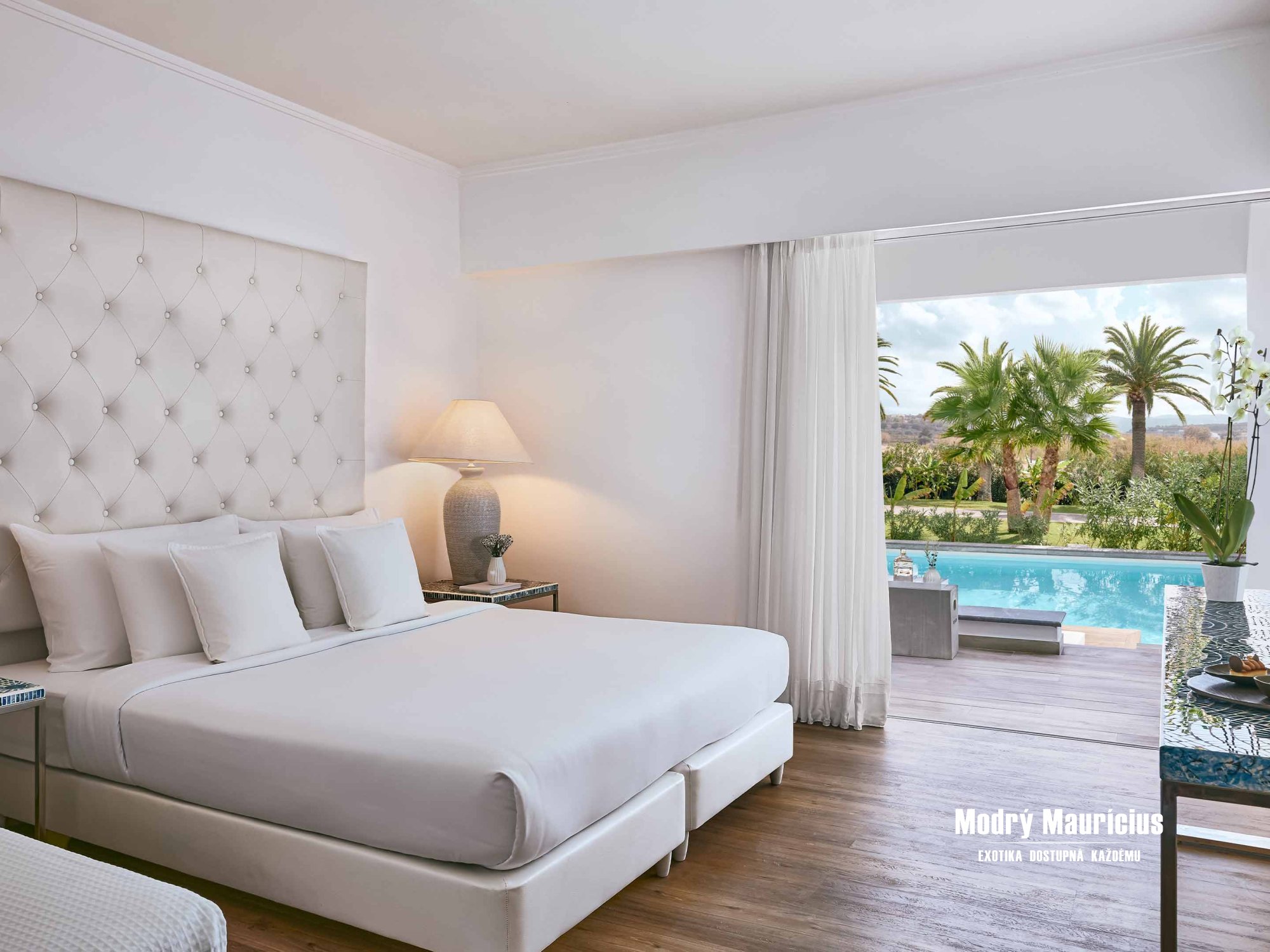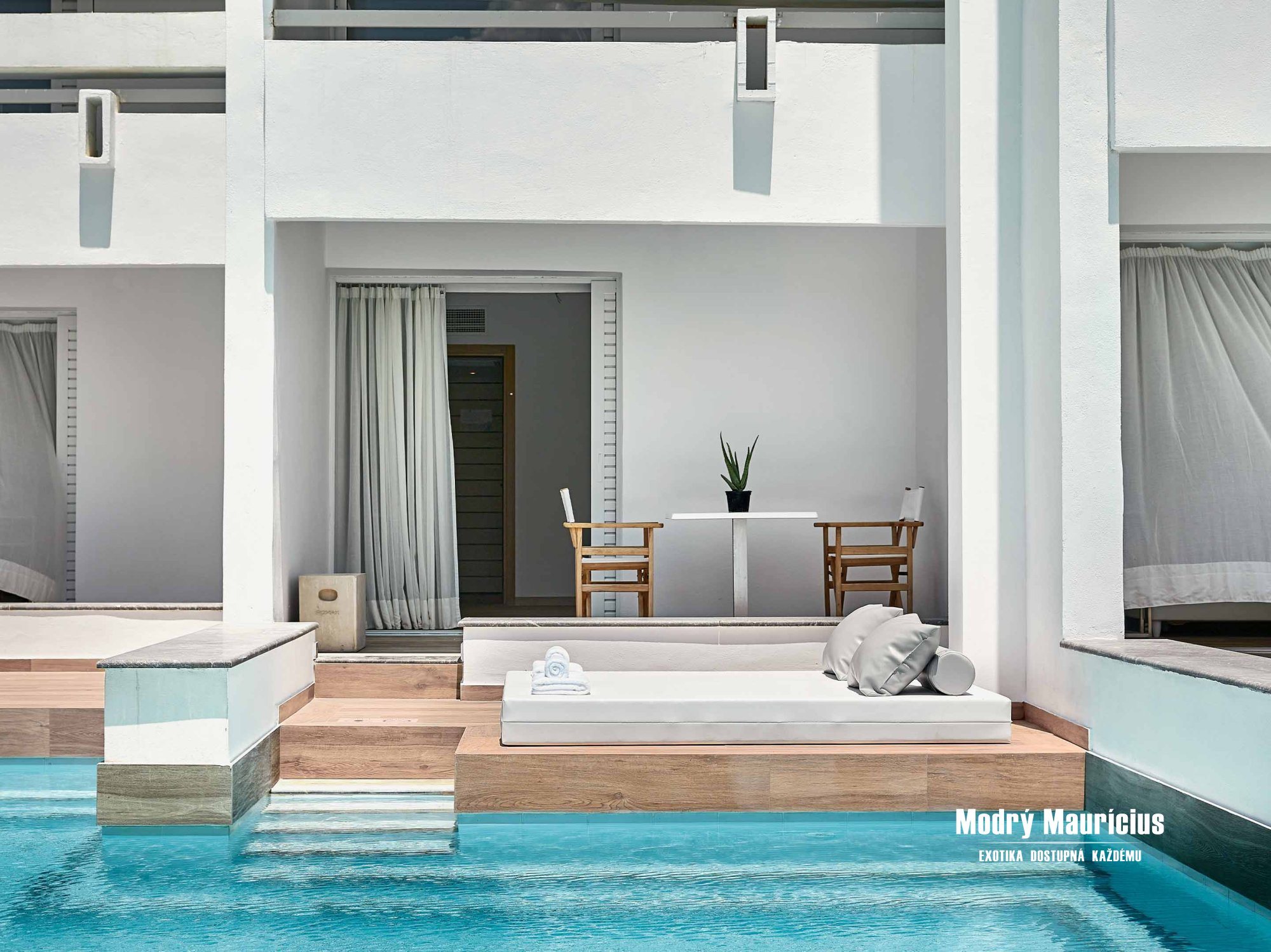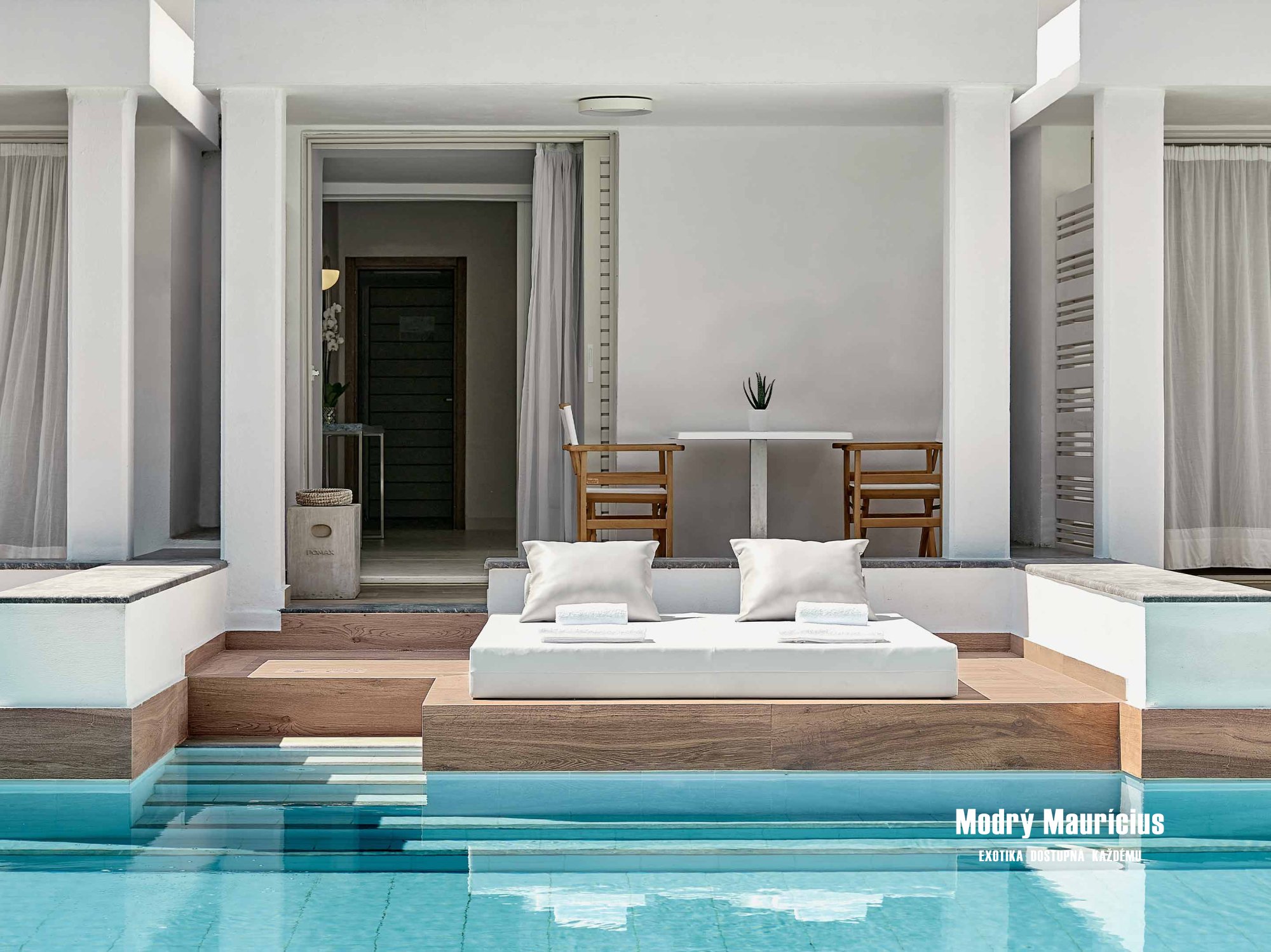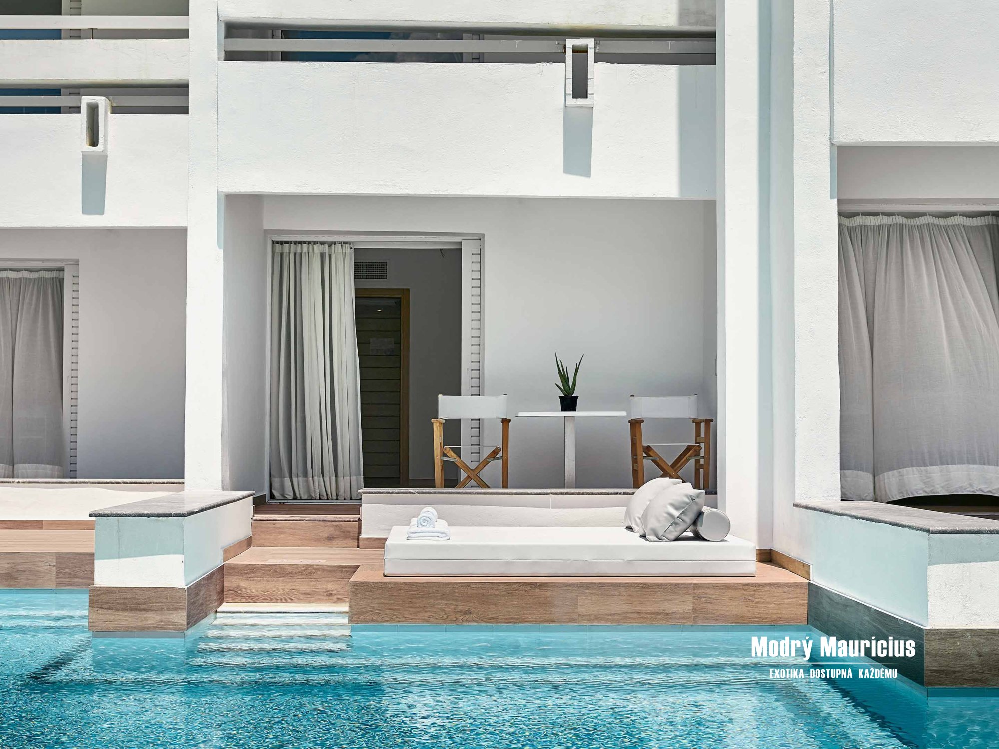 Novinkou na rok 2020 sú tieto útulné izby v stredomorskom štýle so vstupom do zdieľaného bazéna priamo z terasy. Nový moderný interiér izby (27 m²), ktorému dominuje veľká manželská posteľ, oplýva bielou farbou doplnenou modrými prvkami. Izba je určená pre dve dospelé osoby a má výhľad do záhrady.