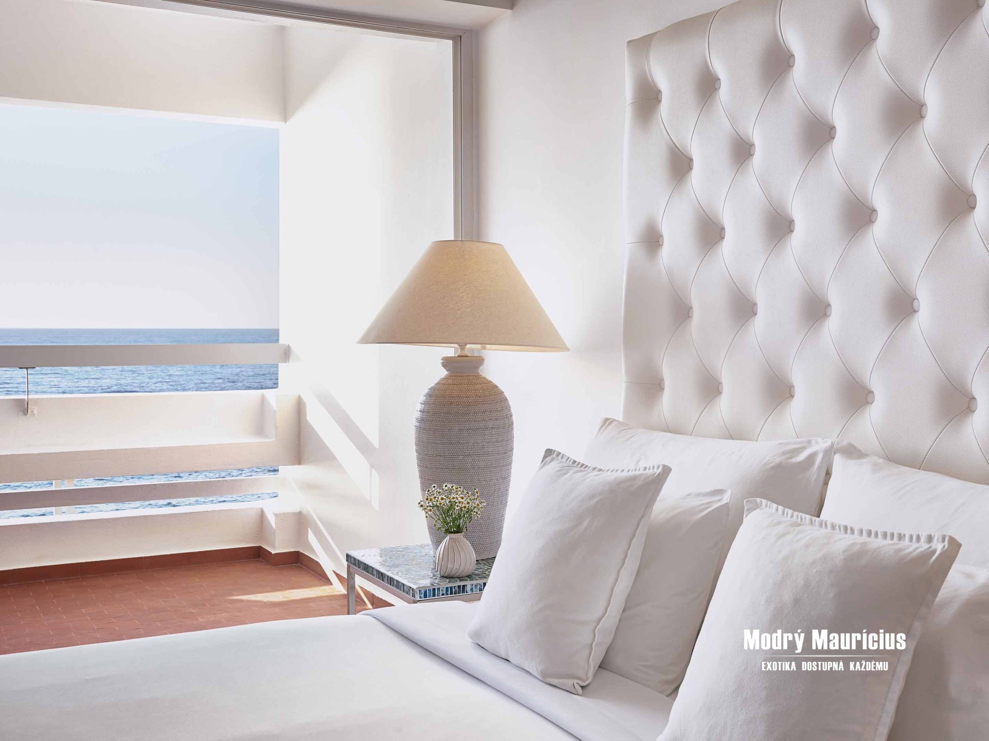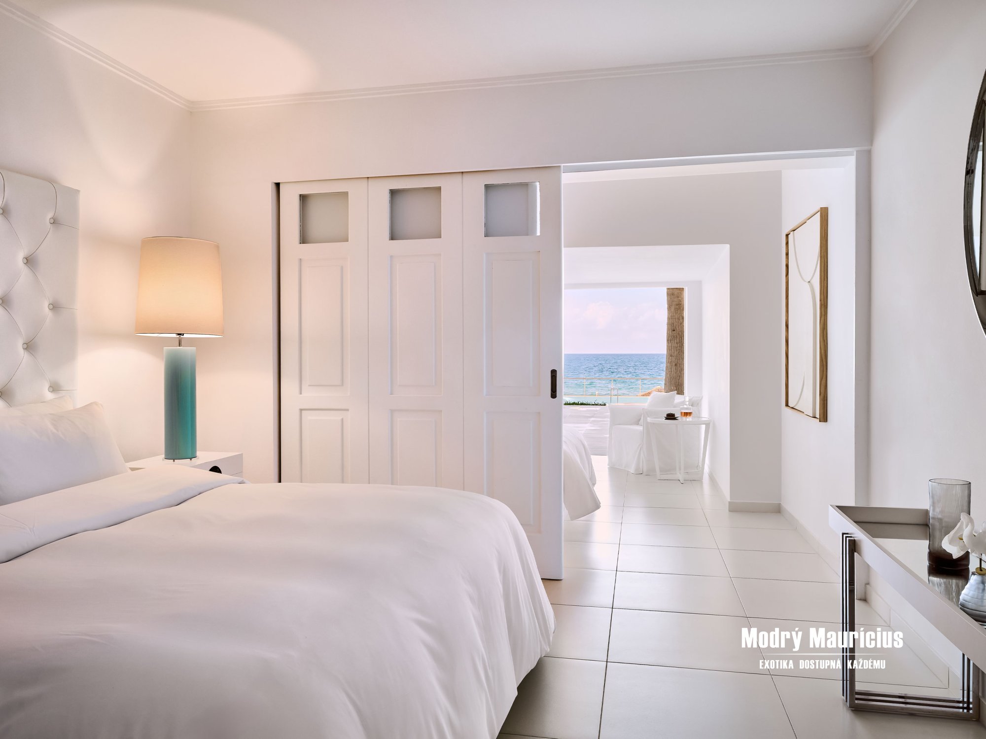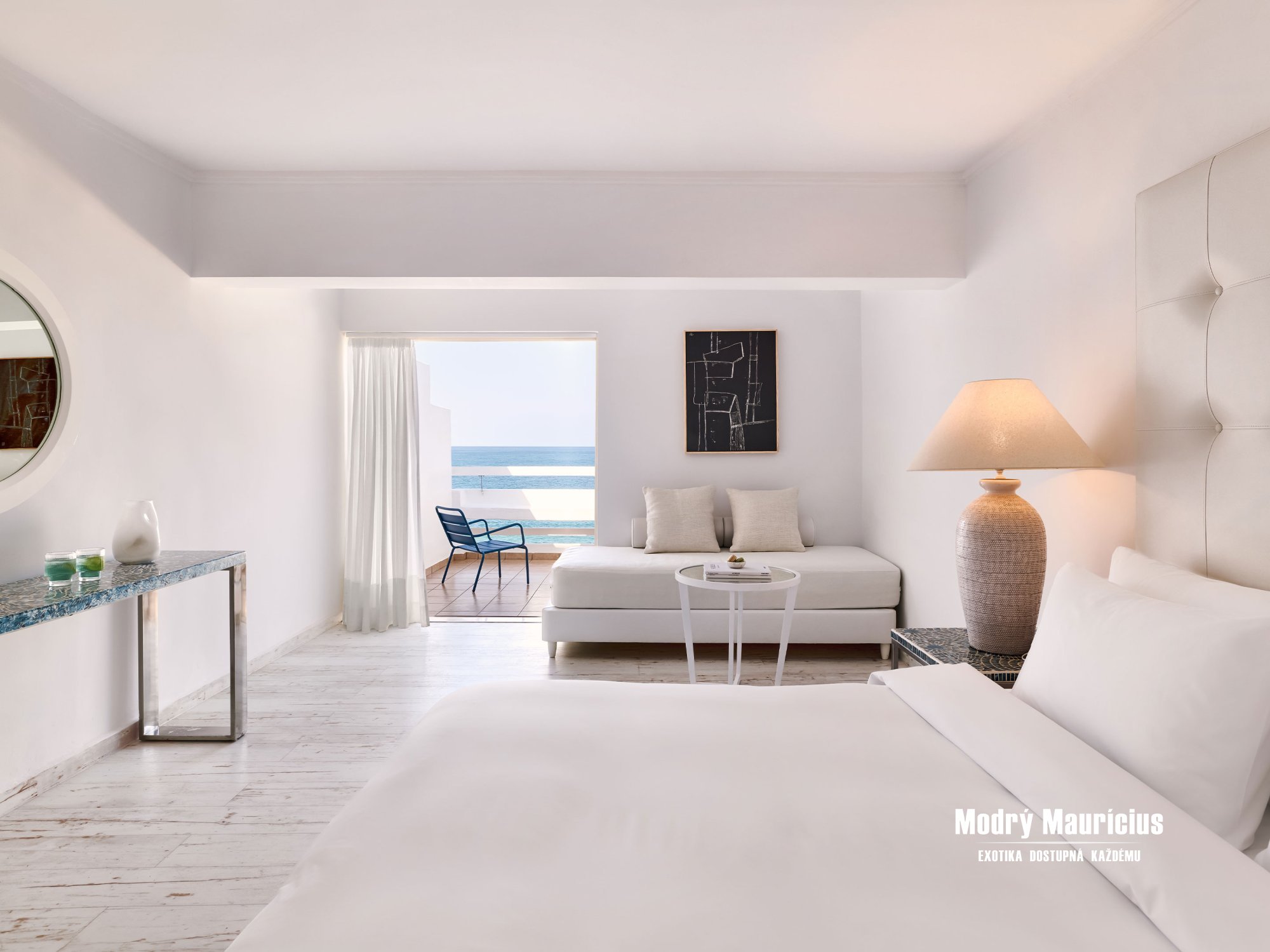 Pohodlné izby v stredomorskom štýle lákajú ľahkými nádychmi farby piesku a mora v inak bielom interiéri...