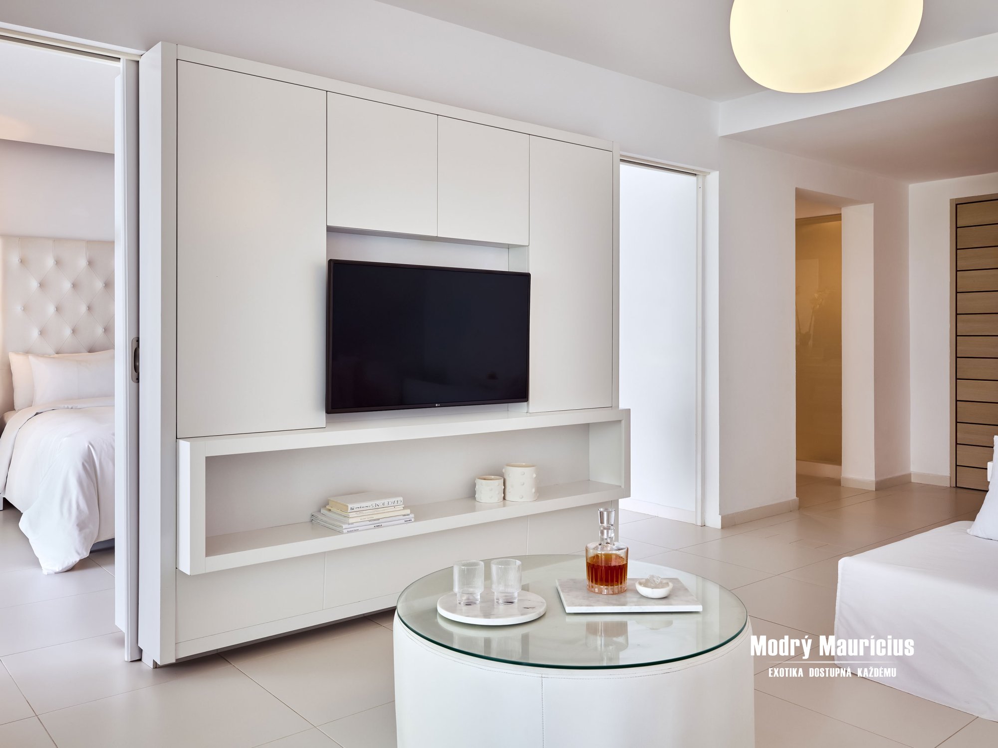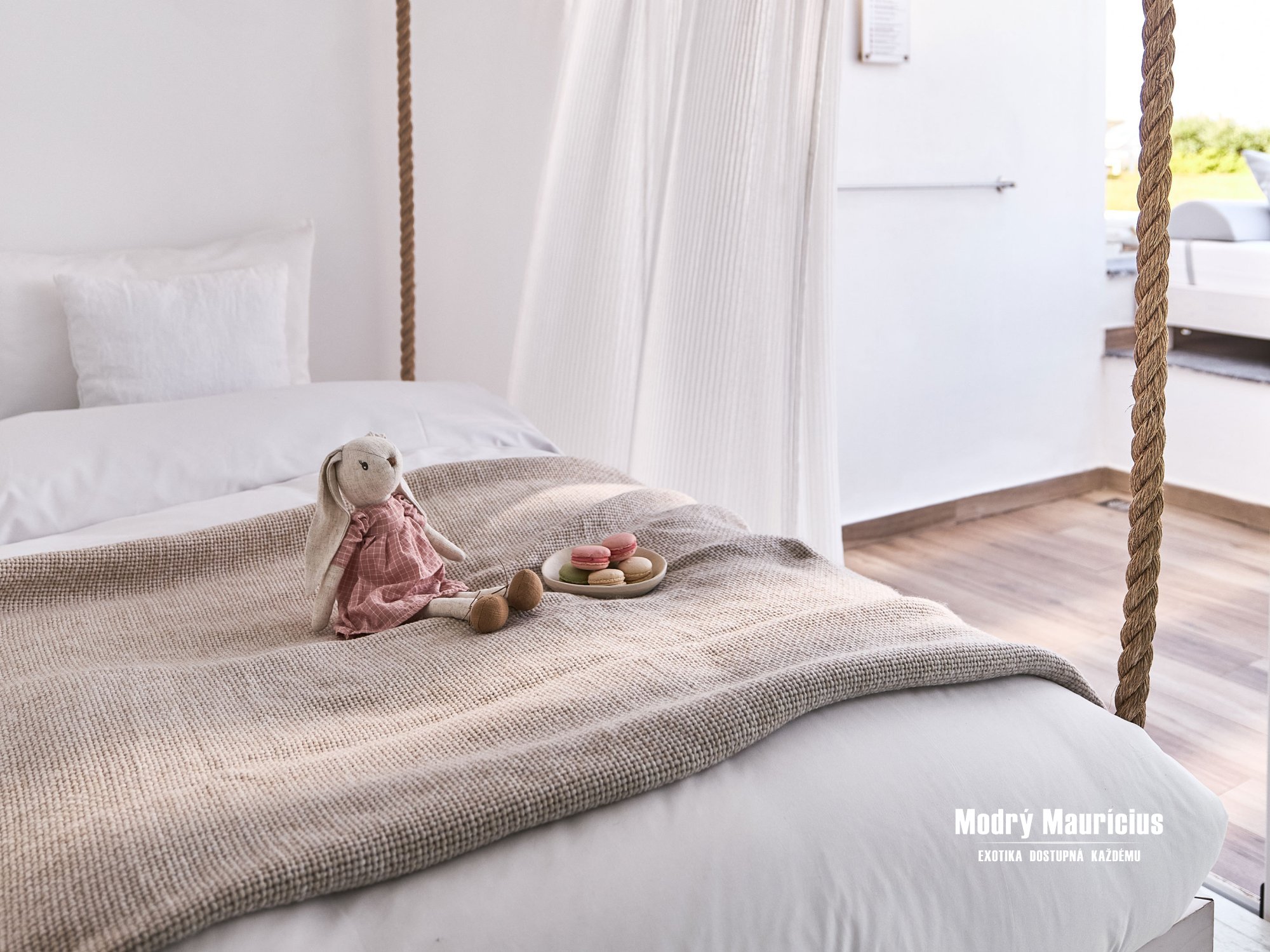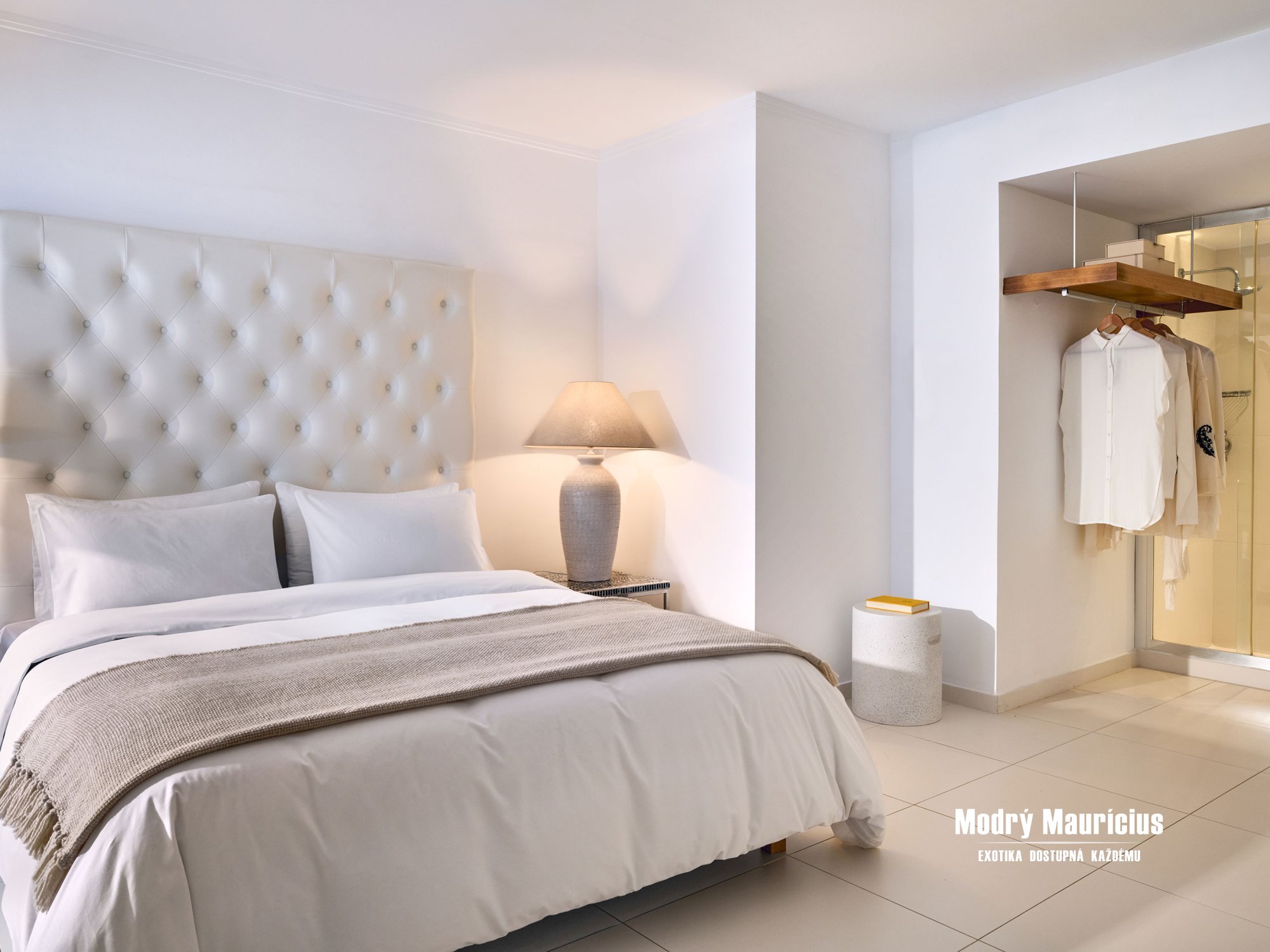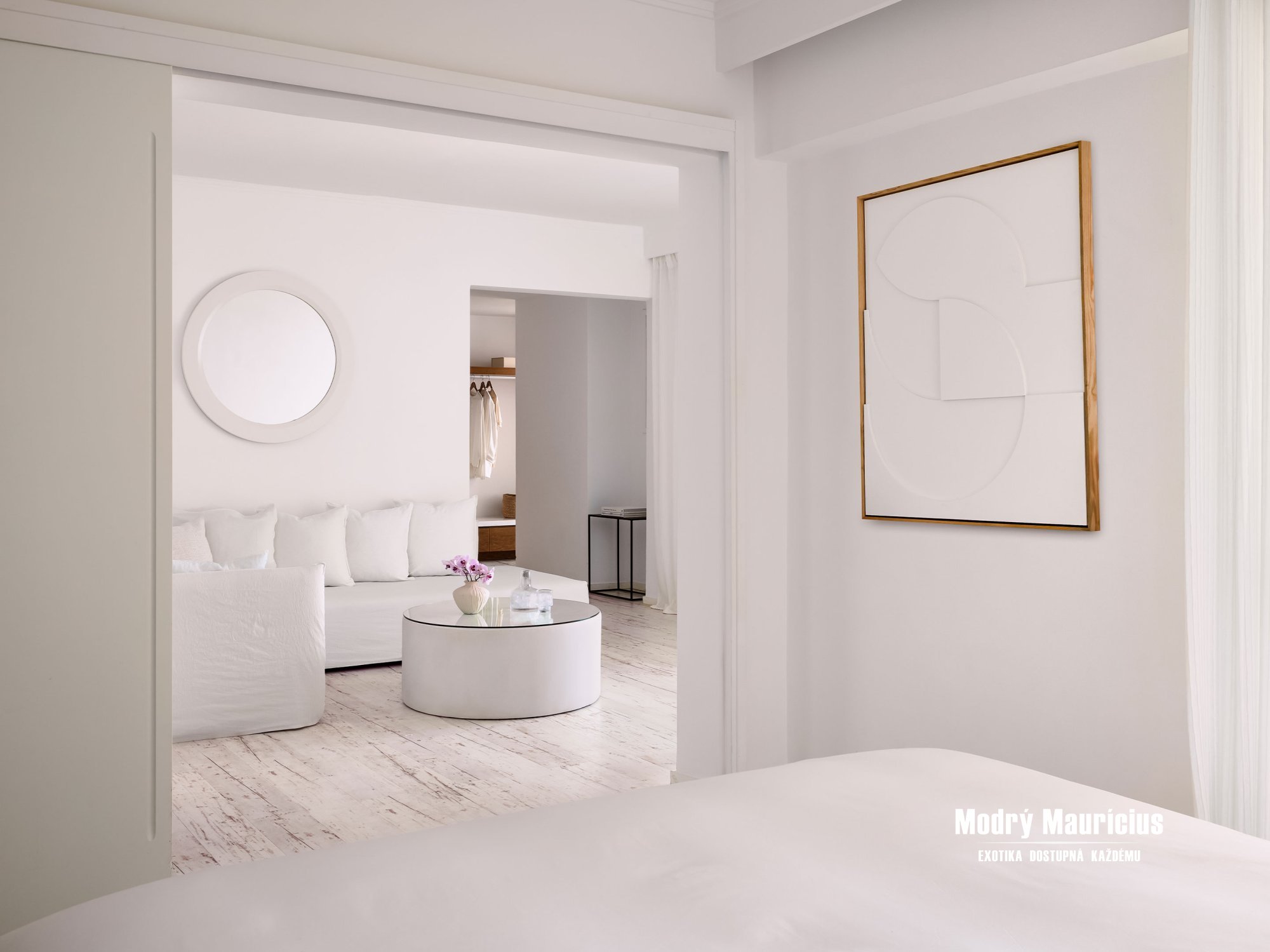 Pohodlné izby v stredomorskom štýle lákajú ľahkými nádychmi farby piesku a mora v inak bielom interiéri...