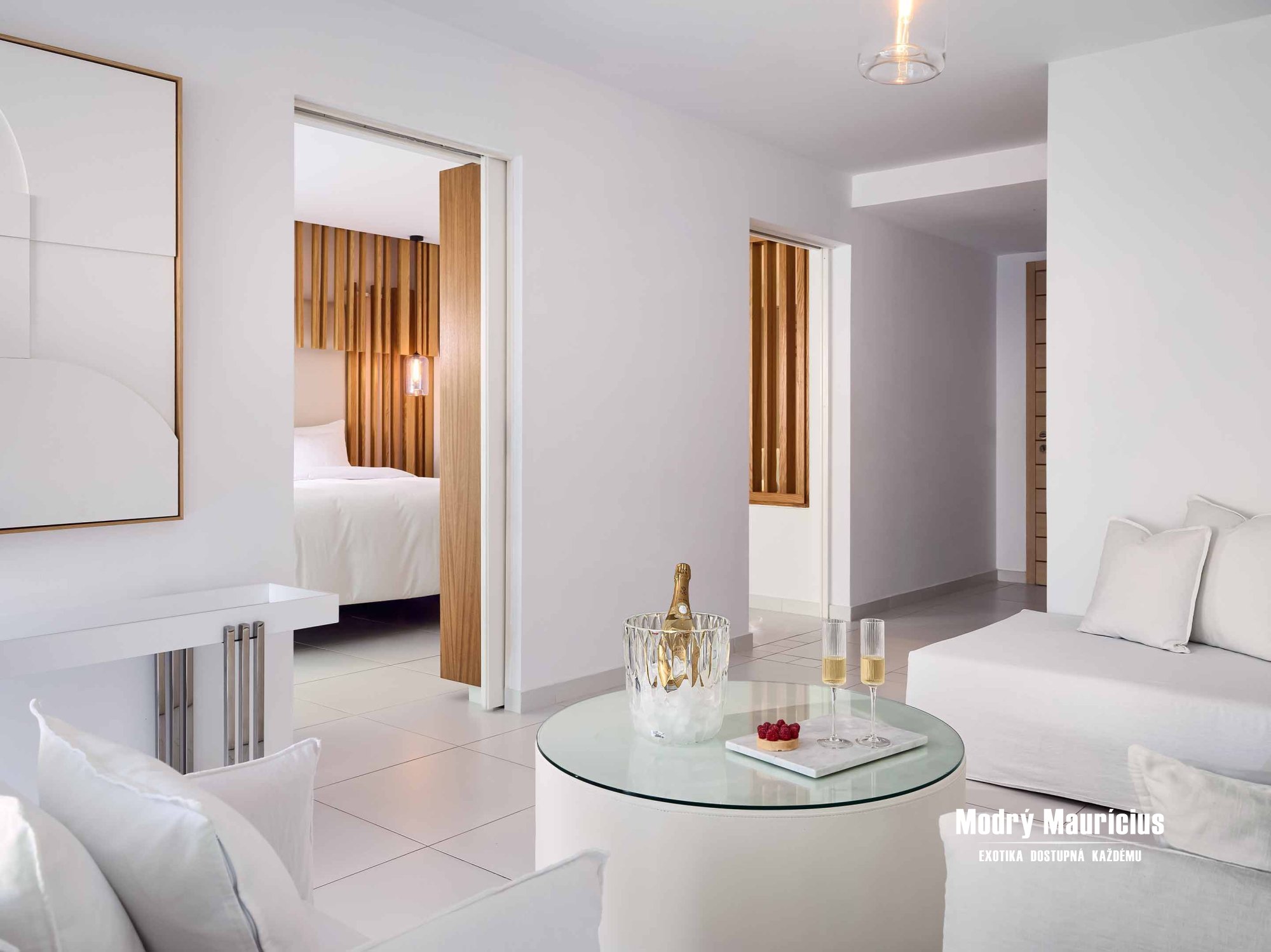 Interiér týchto moderných suít je ladený do luxusnej béžovej doplnenej o tyrkysovú farbu a metalické povrchy, ktoré podčiarkujú vzdušnosť tejto suity s rozlohou 54 m². Suita je tvorená spálňou, obývacou izbou, šatňou a kúpeľňou s vaňou aj sprchovacím kútom. Suita je vhodná pre 2 dospelých a 2 deti, ktoré sa pohodlne vyspia na rozkladacej pohovke v obývacej izbe. Z priľahlej záhrady (40 m²) s úchvatným výhľadom na more sa dostanete k infinity bazénu. Suity sa nachádzajú v krídlach Blue a Rethymno na prízemí.