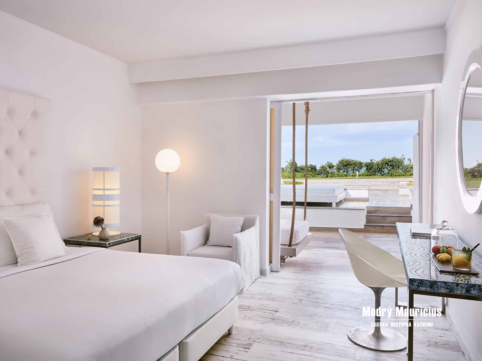 Chcete si zaplávať v bazéne, ktorý je len pár krokov z vašej izby? Potom si k dovolenke vyberte práve tento zrenovovaný bungalov nachádzajúci sa na prízemí hotelových krídiel White, Palace a Rethymno. Bungalovy disponujú výhľadom na more a priamym prístupom do exkluzívneho hotelového bazéna zdieľaného niekoľkými ubytovacími jednotkami. Nový moderný interiér izby (35 m²), ktorému dominuje veľká manželská posteľ, oplýva bielou farbou doplnenou modrými prvkami. Zo spálne vstúpite do oddeleného priestoru s pohovkou. Z tohto priestoru sa cez francúzske okná dostanete na terasu so záhradou a spomínaným bazénom. Do izby sa pohodlne zmestia dvaja dospelí s jedným dieťaťom.