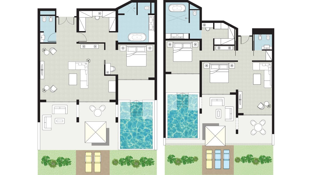 Vily sa pýšia unikátnym dizajnom a svetlým interiérom s rozlohou 85 m² a záhradou o veľkosti 60 m² so sprchou a slnečníkmi. Zároveň sú stelesnením komfortu a nekonečných výhľadov na tyrkysové more. V hlavnej spálni nájdete posteľ o veľkosti king a dve oddelené lôžka, zatiaľ čo pridružené obývacie priestory disponujú dvoma pohovkami. Dostatok súkromia pre ubytovaných hostí poskytnú dve kúpeľne so zdvojenými umývadlami, vaňou a oddelenou sprchou. Priamo na privátnej záhrade je vyhrievaný bazén s opaľovacími lehátkami v tesnej blízkosti pláže.