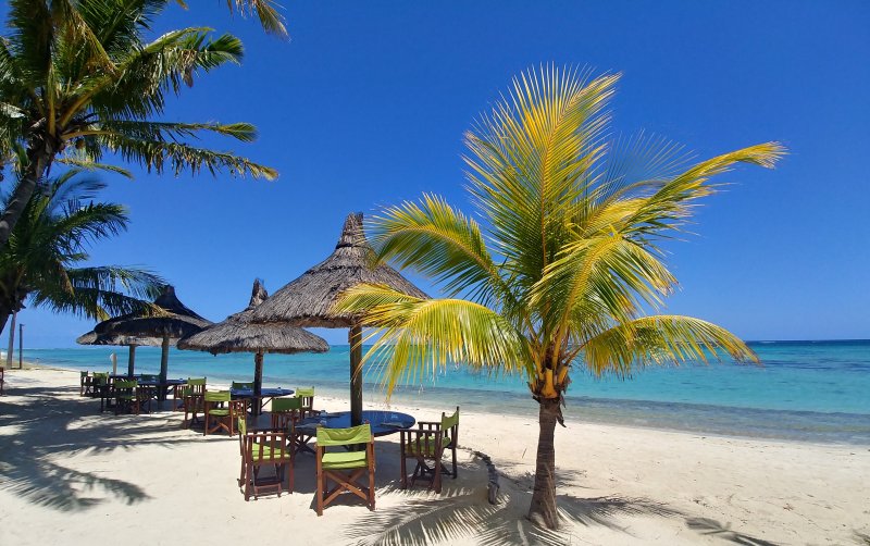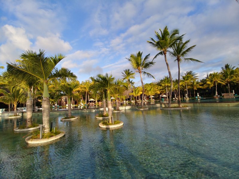 Pláž v hlavní části hotelu pokrývají kameny, pro koupání lze využít menší pláž v zadní části areálu hotelu, kde se nachází také centrum vodních sportů. Zde se nabízí i romantické molo s restaurací. Dalším zajímavým prvkem je umístění stolování uvnitř jednoho z bazénů, které jsme musely vyzkoušet. Oběd ve zdejší restauraci Isle de France s menu z mořských plodů nám velice chutnal. Tento resort určitě doporučíme těm, kteří hledají ničím nerušený odpočinek, uvolněnou atmosféru a pohodu.