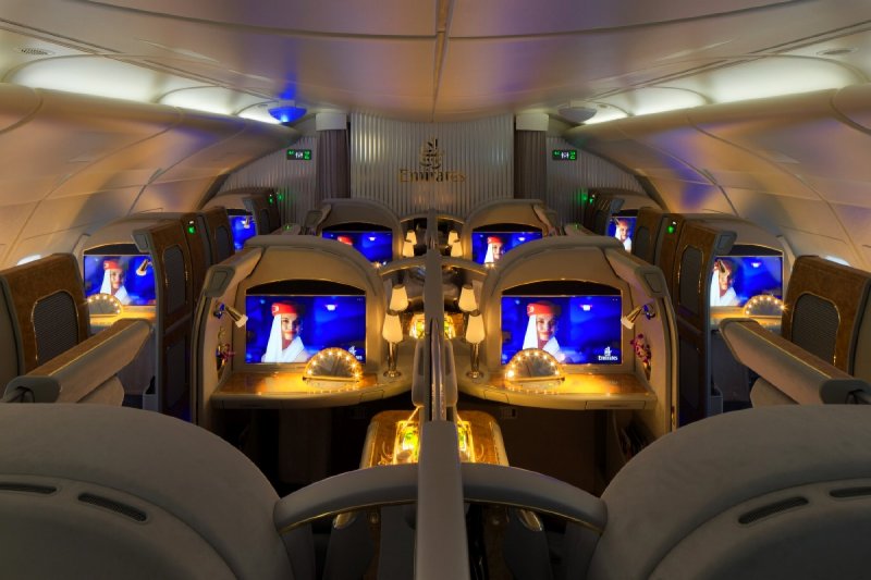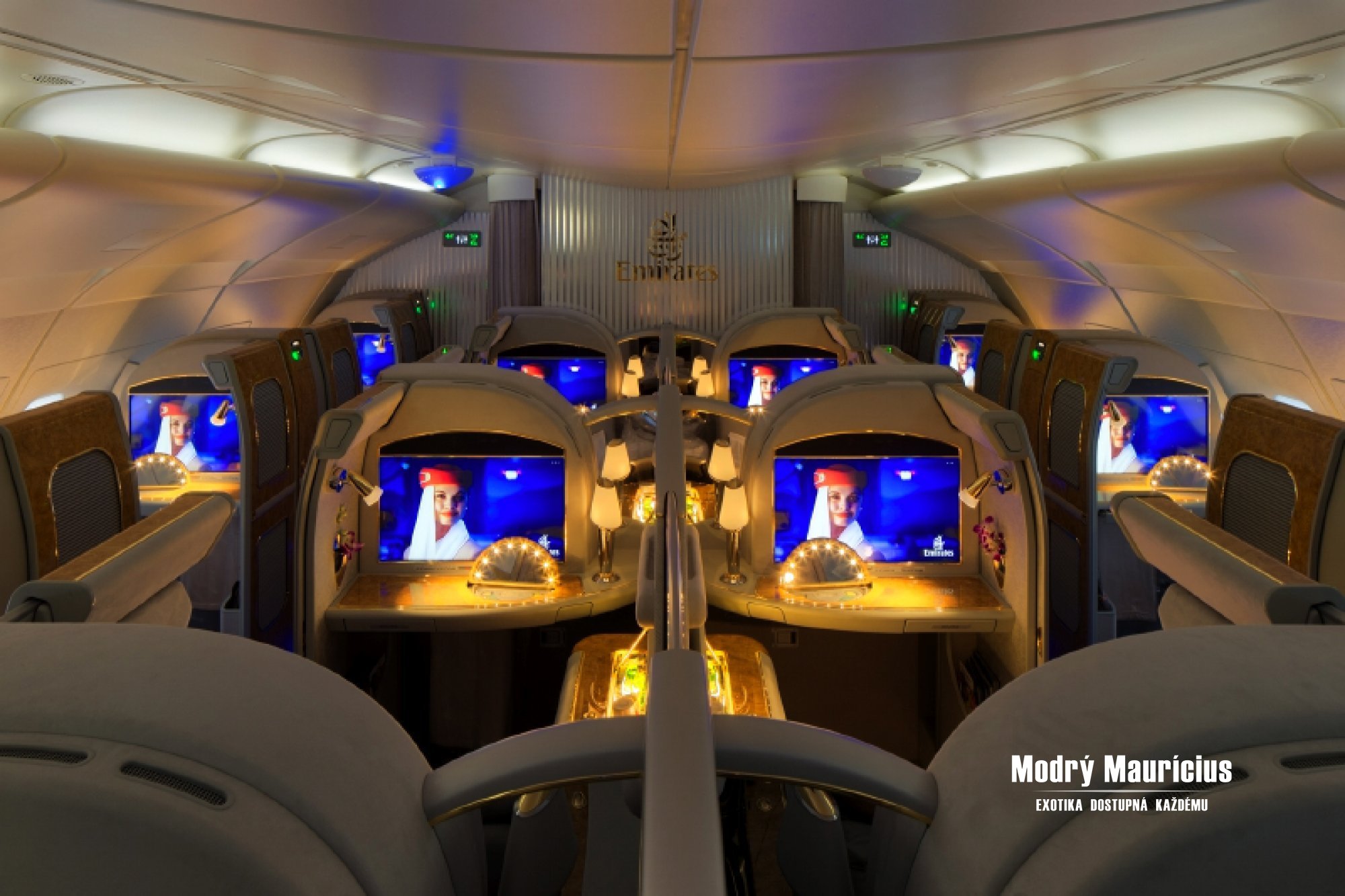 Airbus A380 so svojou vysokou kapacitou a ekonomickým spôsobom prevádzky predstavuje jeden z hlavných pilierov rastu Emirates. Prvá trieda v Emirates A380 poskytuje cestujúcim nový svet inovácie a luxusu, môžu si vychutnať príjemnú eleganciu a pokoj jedinečných súkromných apartmánov (suites) prvej triedy. Každý centimeter týchto suites bol starostlivo vytvorený tak, aby splnil a prekonal všetky vaše očakávania a komfortom sa vyrovnal cestovaniu súkromným lietadlom. Na hornej palube lietadla A380 sú pre cestujúcich prvej triedy k dispozícii nádherne koncipované sprchové kútiky, v ktorých sa môžete rozmaznávať prvotriednou kozmetikou navrhnutou pre stimuláciu Vašich zmyslov a relaxáciu. Salónik na palube Airbusu A380 je k dispozícii cestujúcim prvej a business triedy a je možné sa tu občerstviť alebo len tak relaxovať.