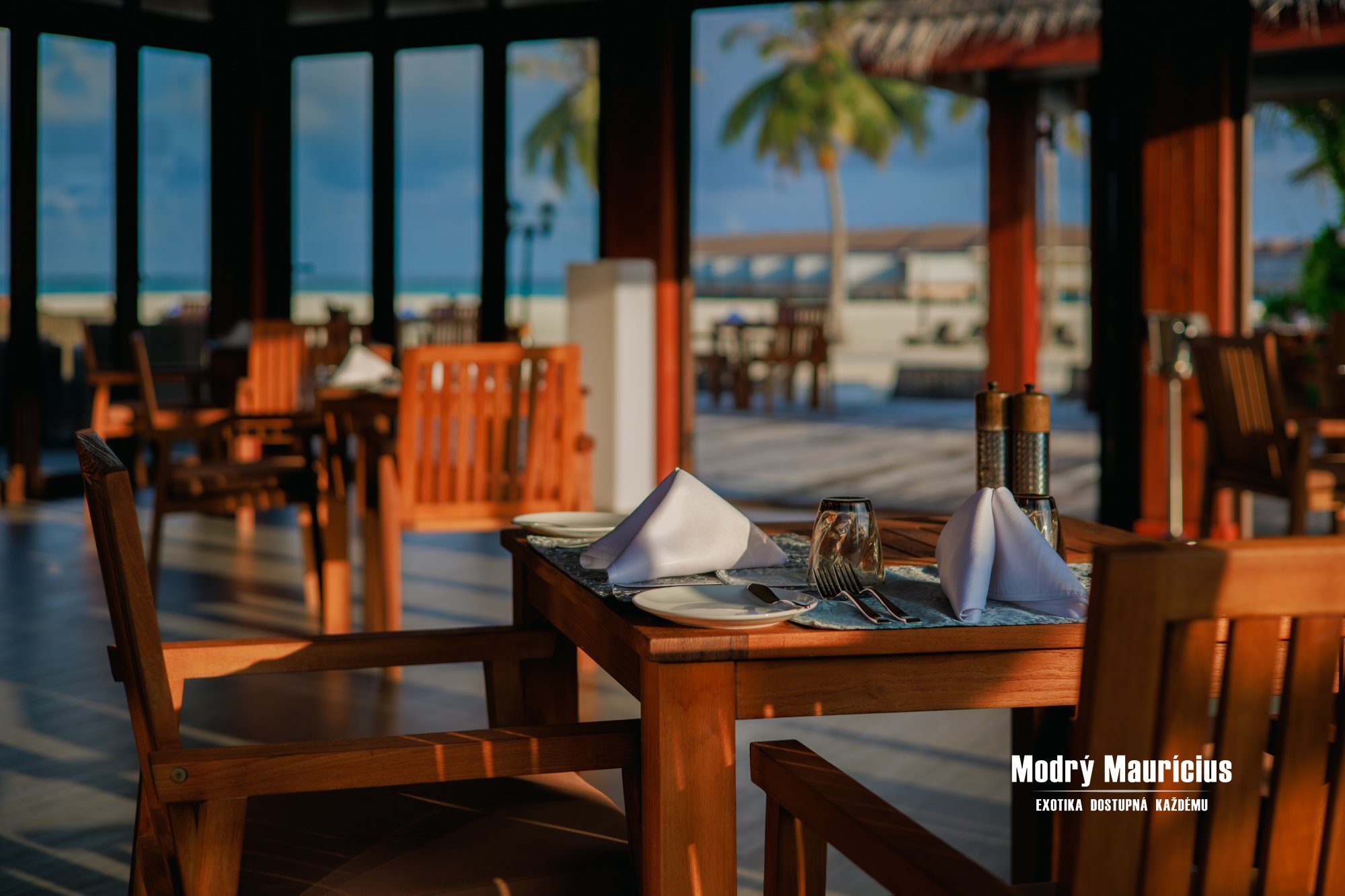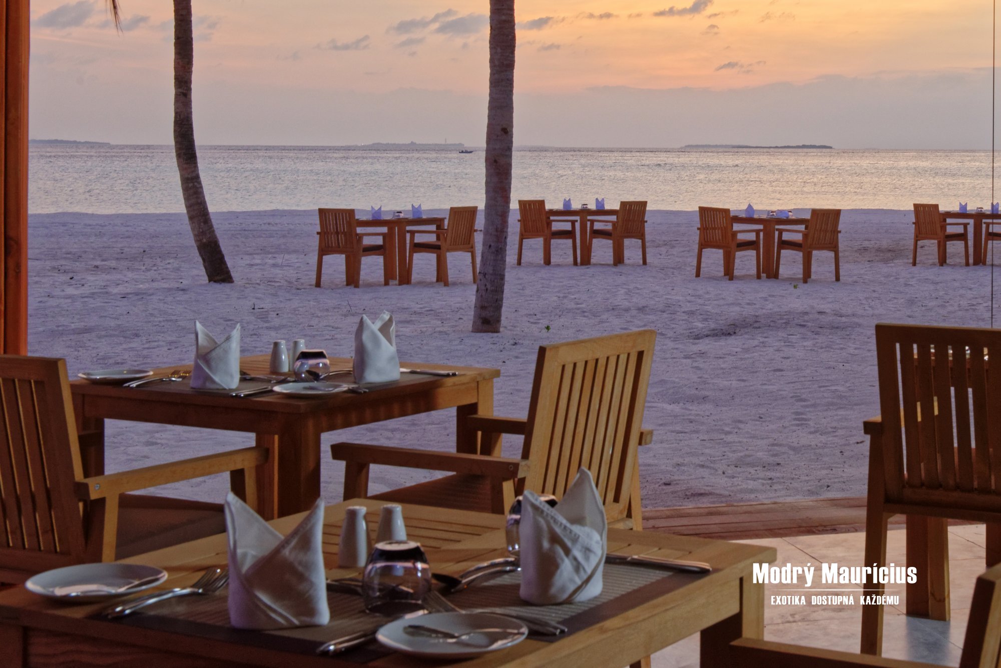Sunset Grill & Bar – Vychutnajte si dych vyrážajúci západ slnka spolu s výberom lahodných grilovaných pokrmov. V tejto à la carte reštaurácii sa podáva všetko od grilovaných morských plodov až po mäso podľa vášho výberu. Reštaurácia s vnútorným aj vonkajším posedením (kapacita 100 osôb) sa nachádza hneď vedľa obrovskej pláže a ponúka výhľad na vily týčiace sa priamo nad vodou. Môžete si tiež rezervovať romantickú večeru na pláži (v závislosti od dostupnosti a počasia).