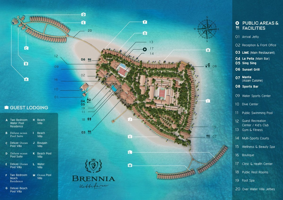 Pri pobreží ostrova je rozmiestnených 45 plážových víl s úchvatným výhľadom na oceán. Tieto vily sa pýšia priamym prístupom na bielu piesočnú pláž Brennia a vonkajšou sprchou.