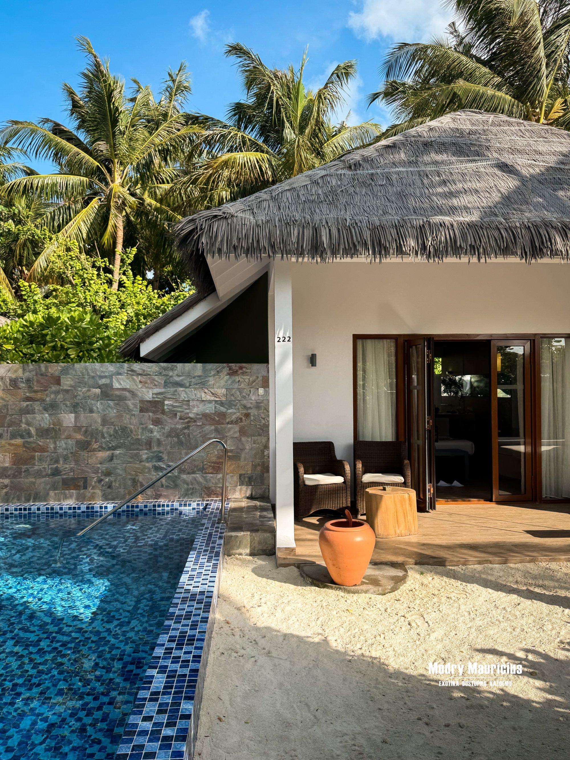 Plážové vily jsou ukázkou spojení maledivské přírodní krásy a vytříbeného italského stylu. V každé vile se nachází koupelna s venkovním sprchovým koutem a ložnice s komfortní manželskou postelí. Vila je umístěná v plážovém dvojdomku společně s další vilou (tzn. v jedné budově jsou dvě tyto vilky). Terasy obou vilek jsou za sebou tak, abyste měli soukromí, a navíc jsou odděleny přepážkou a hustou zelení. Každý má svá lehátka i vlastní vstup na pláž.
