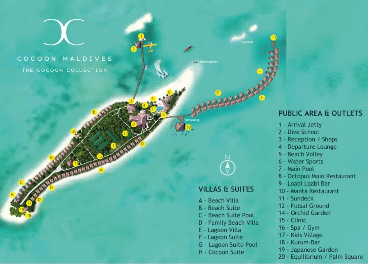 Resort Cocoon Maldives se nachází na písčitých plážích ostrova Ookolhufinolhu, který zahrnuje plochu 7 hektarů a měří 600x100 metrů. Ostrov leží v atolu Lhaviyani, který je od mezinárodního letiště v Malé vzdálen 30 minut letu hydroplánem. Prostředí resortu je opravdu překrásné. Malebná laguna a rozlehlé pláže vytváří perfektní místo pro romantickou i rodinnou dovolenou, svatby a jiné zvláštní příležitosti. Ostrov skýtá možnost nezapomenutelného potápění a šnorchlování díky nedotčeným korálovým útesům, které jsou domovem majestátních mant, delfínů a mořských želv. Po celý rok je prosluněný Lhaviyani atol ovíván slabým osvěžujícím monzunem a omýván příjemně teplými vodami Indického oceánu, což z něj dělá perfektní destinaci pro Vaši dovolenou.